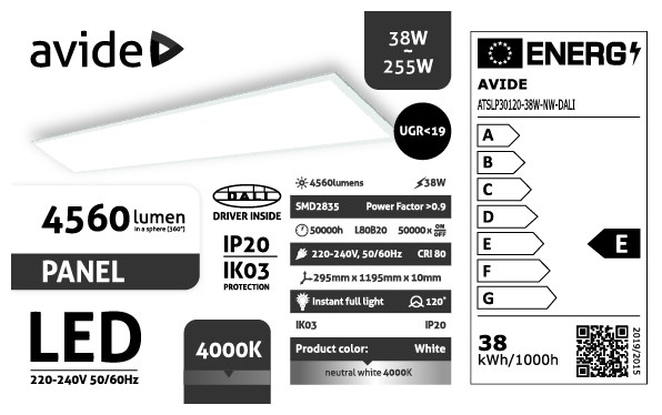 Avide Led Panel 300x1200mm 38W NW 4000K 4560lm UGR<19 IP20 DALI Industrial V2